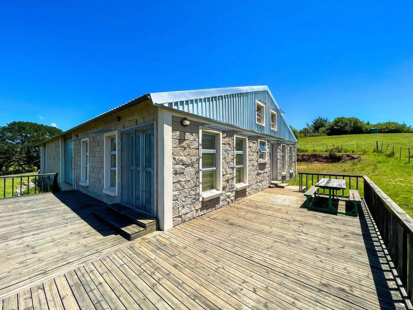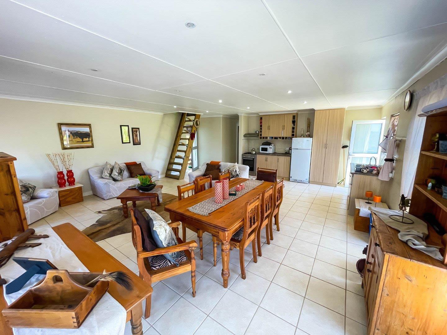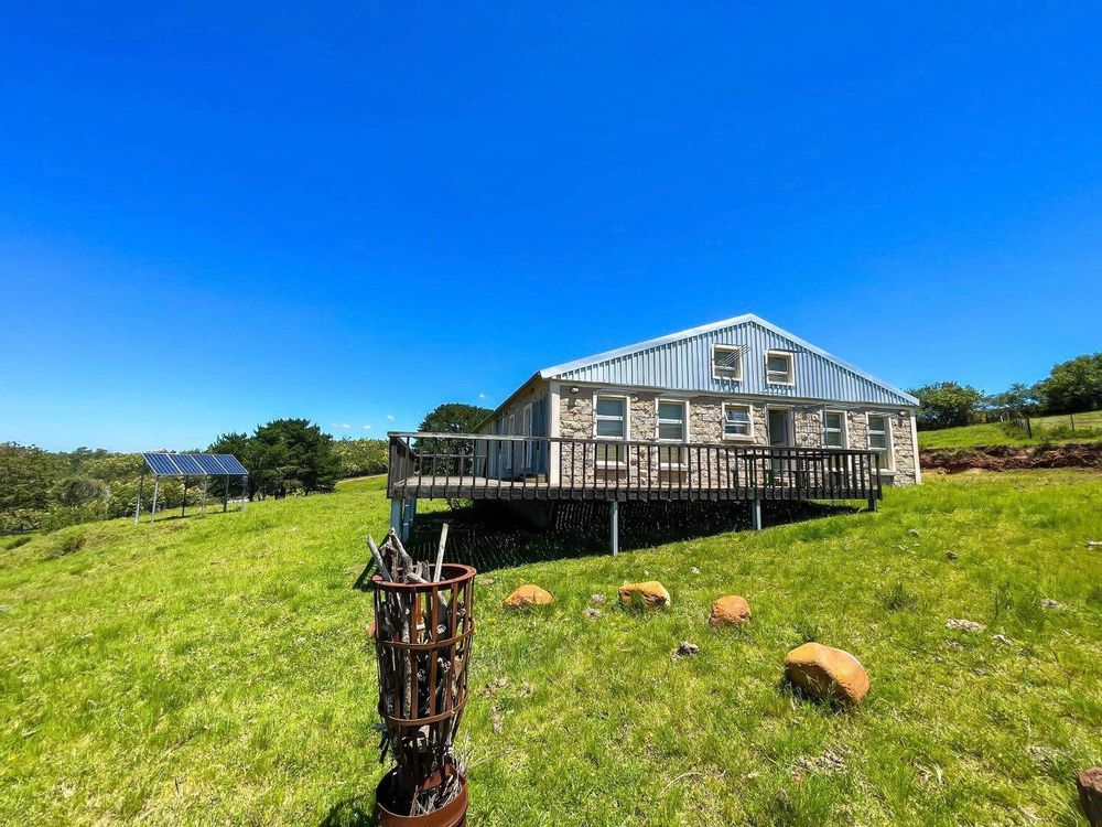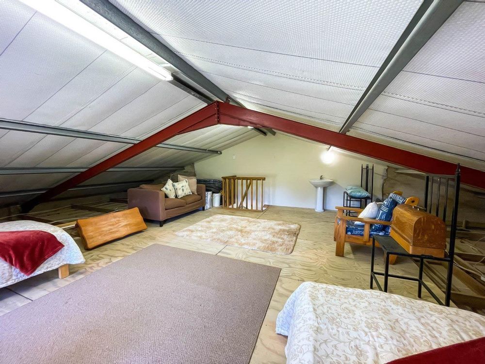 The main building, constructed six years ago with durable brick and a sink roof, efficiently combines storage and living spaces. Inside, enjoy a spacious open-plan kitchen, dining, and lounge area leading to a large bedroom with an ensuite bathroom featuring a shower, toilet, and basin. An additional guest toilet is available alongside a versatile loft room that can serve as extra sleeping quarters or be adapted to include an upstairs bathroom. Storage needs are well-catered for with a dedicated area equipped with large doors for easy access to tools and farm essentials. The expansive outdoor deck wraps around two sides of the building, offering an ideal space for entertaining, complete with a built-in braai area.