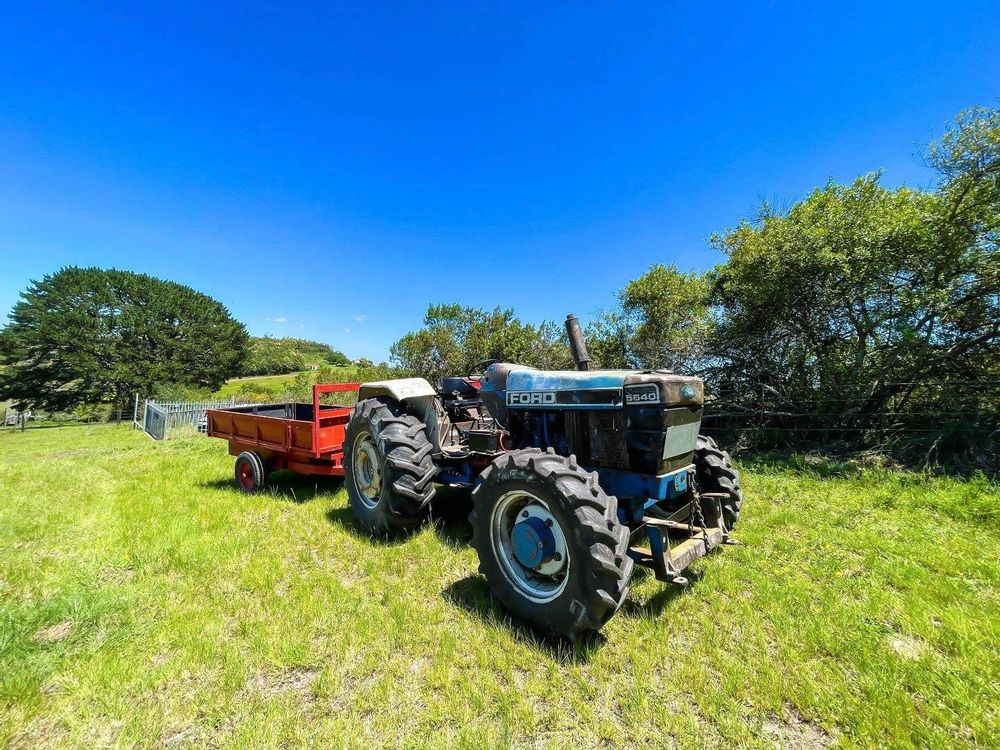 A large Ford tractor, slasher, and a variety of tools and equipment are included to support your small-scale farming ventures.