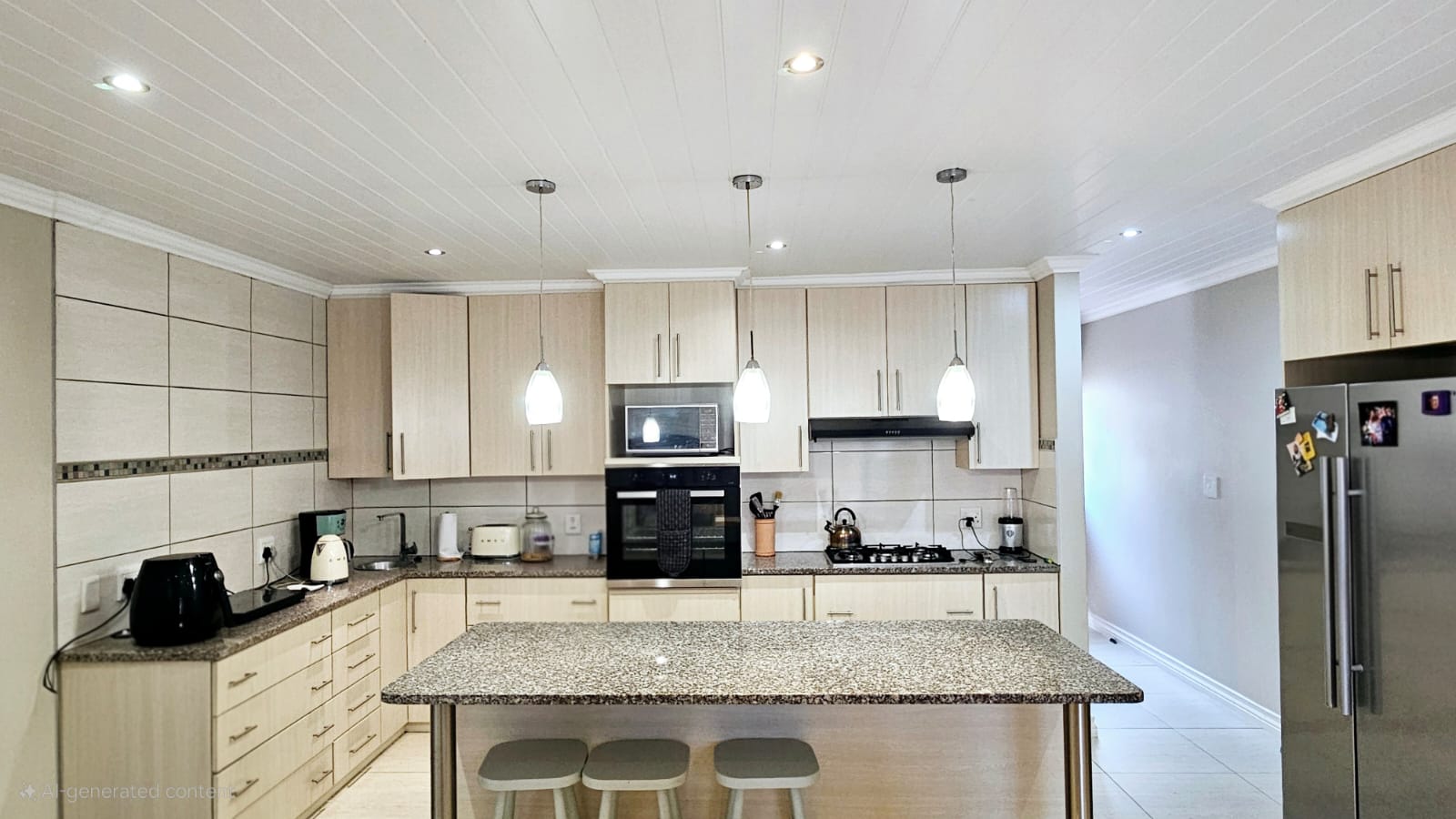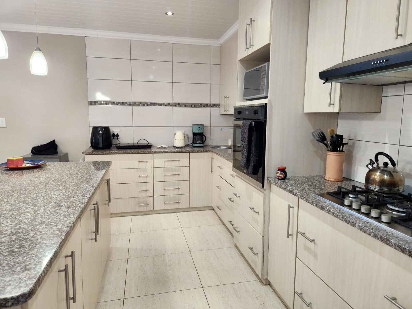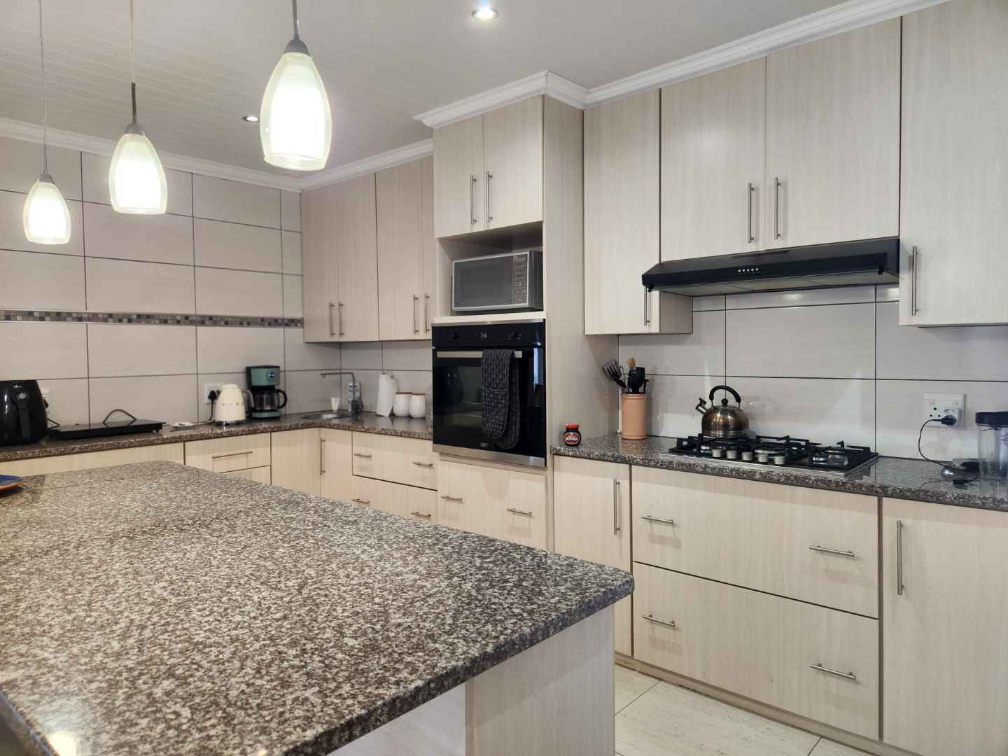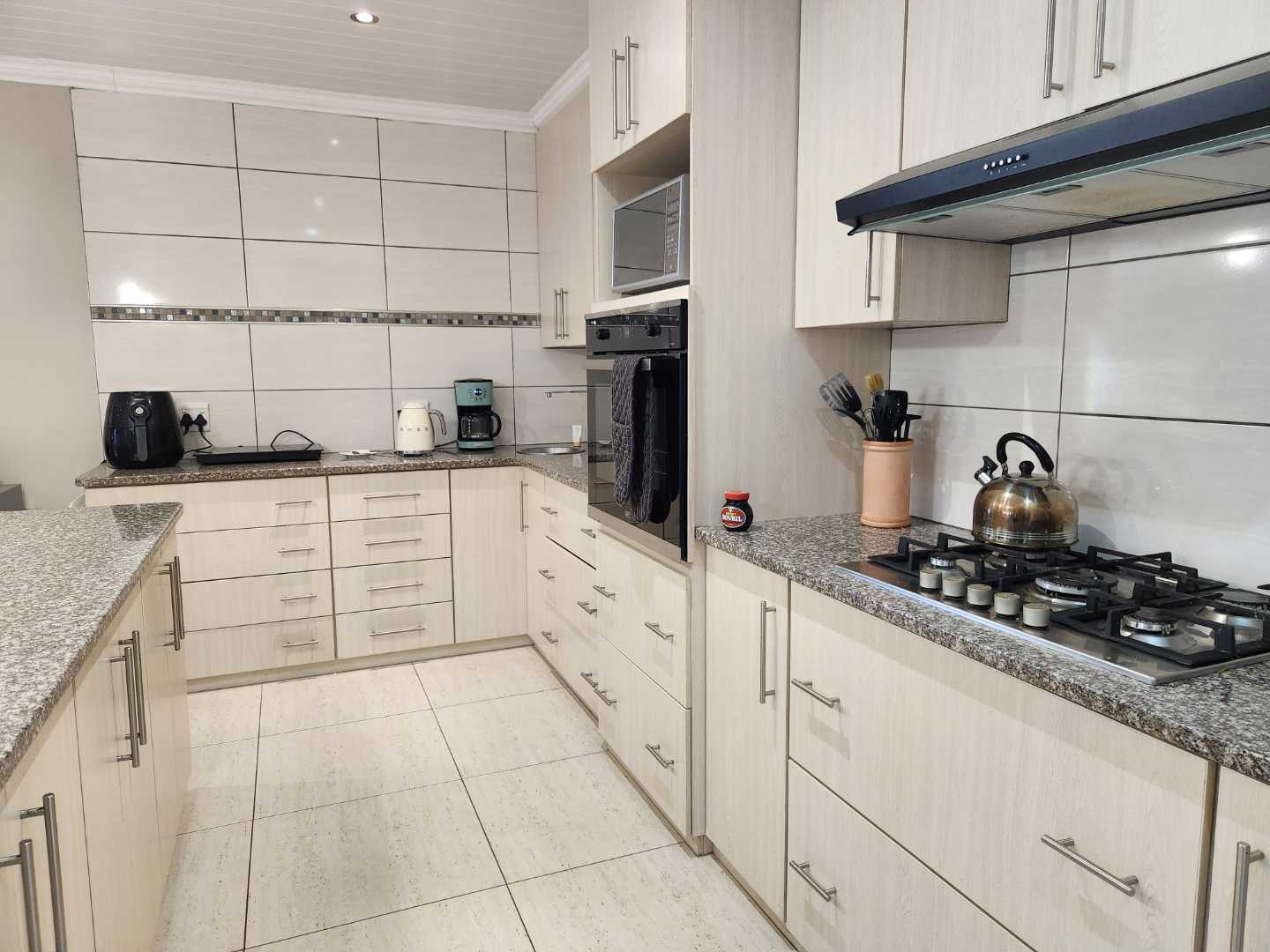 Step inside to discover three well-sized bedrooms with built-in cupboards, offering ample space for the entire family. Enjoy two neat bathrooms, including a main en-suite for added privacy and comfort. The spacious open-plan kitchen is a chef's delight, featuring a gas hob, electric oven, and a separate scullery for seamless meal preparation.